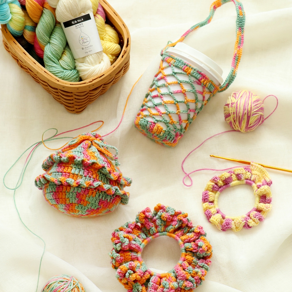 染めた「染-marche毛糸」1かせで編める小物作品をご紹介します。